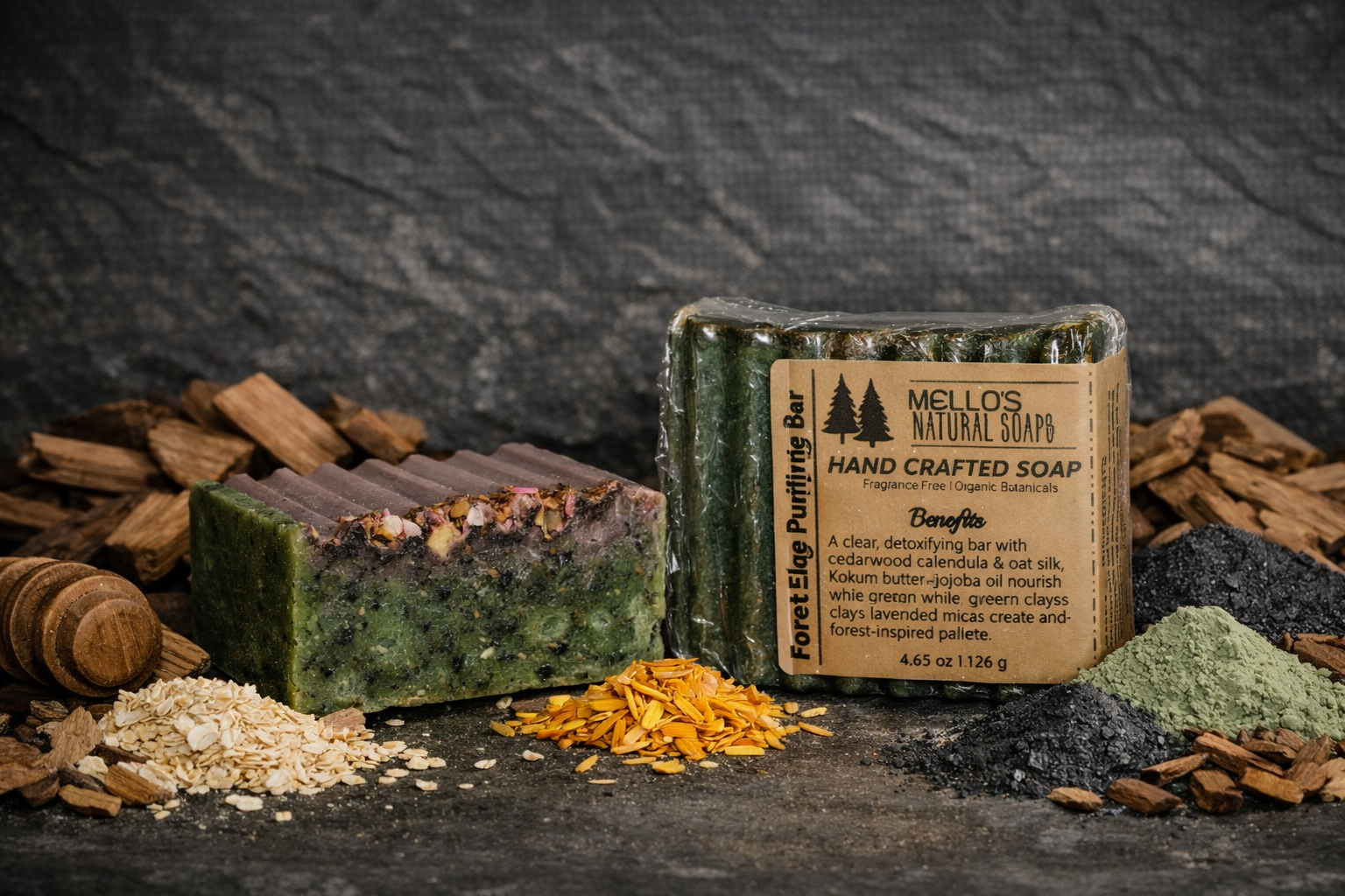Glycerin base, jojoba oil, kokum butter, calendula oil, kaolin clay, French green clay, colloidal oatmeal, calendula powder, deep green mica, Persian green mica, parakeet green mica, robin’s egg mica, graphite black mica, cedar wood essential oil.